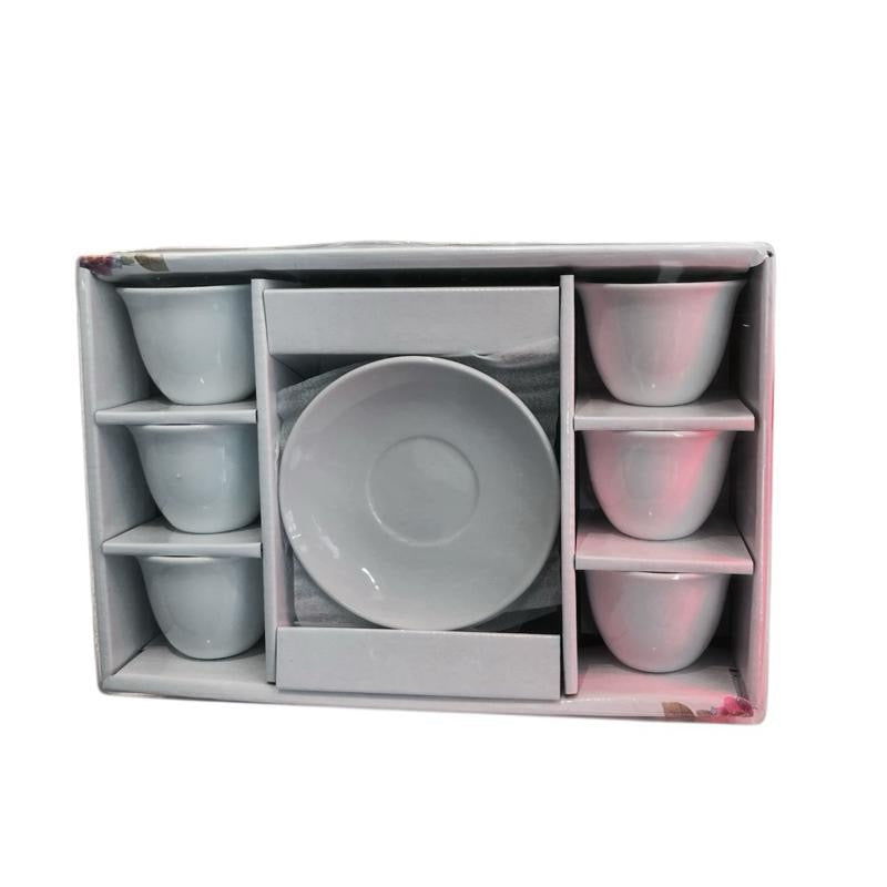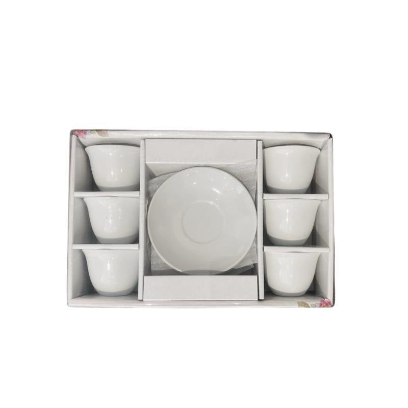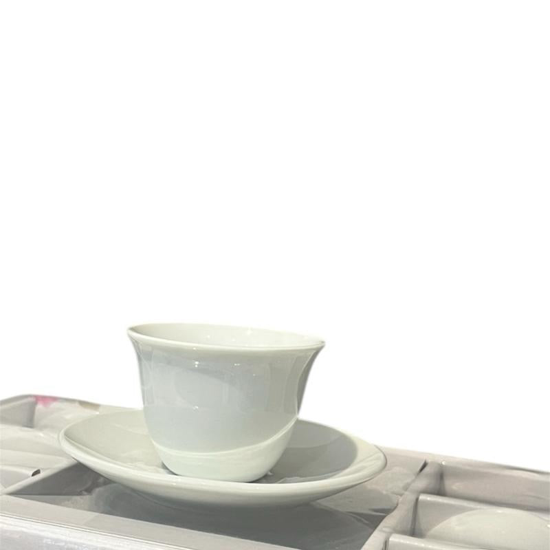 This set includes six white cups and six saucers, perfect for your daily coffee routine. The set is neatly organized, ensuring convenience and style. Each cup is paired with a matching saucer, creating a harmonious look.