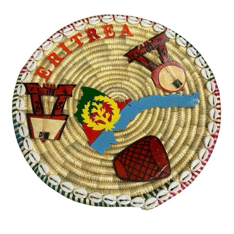 Eritrean Culture Decor is a traditional basket made of dyed grass straws and palm leaves.