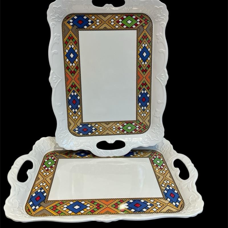 Make your coffee breaks effortless or indulge in a cozy meal in bed with our Serving Tray Set, adorned with stunning Eritrean and Ethiopian Ediyat designs. No more balancing multiple cups – this set provides a sturdy surface for your coffee cup, plate, or bowl, making it the ideal companion for meal prep, coffee moments, or enjoying breakfast in bed.