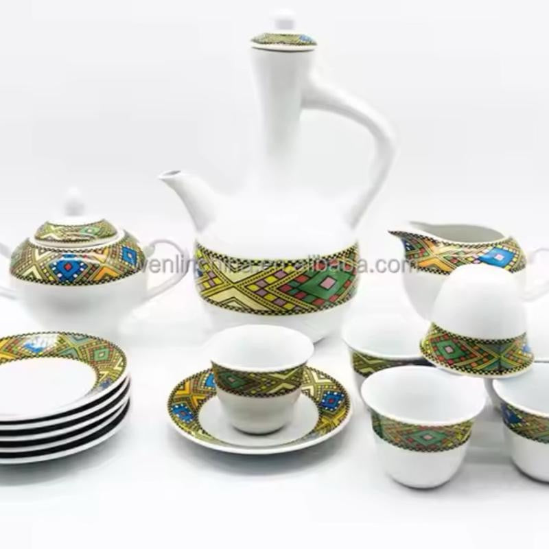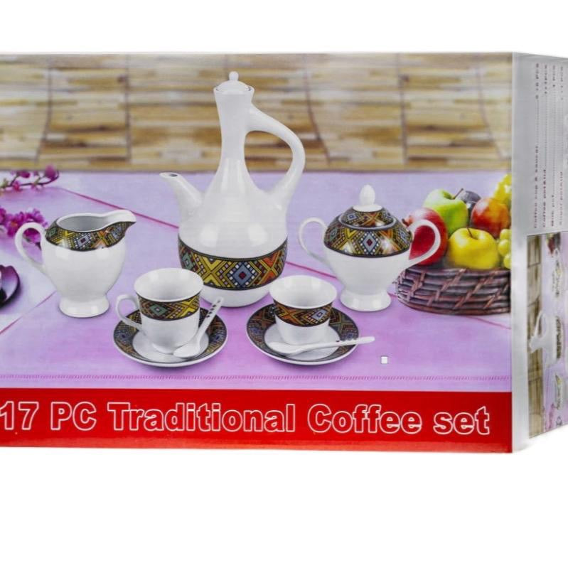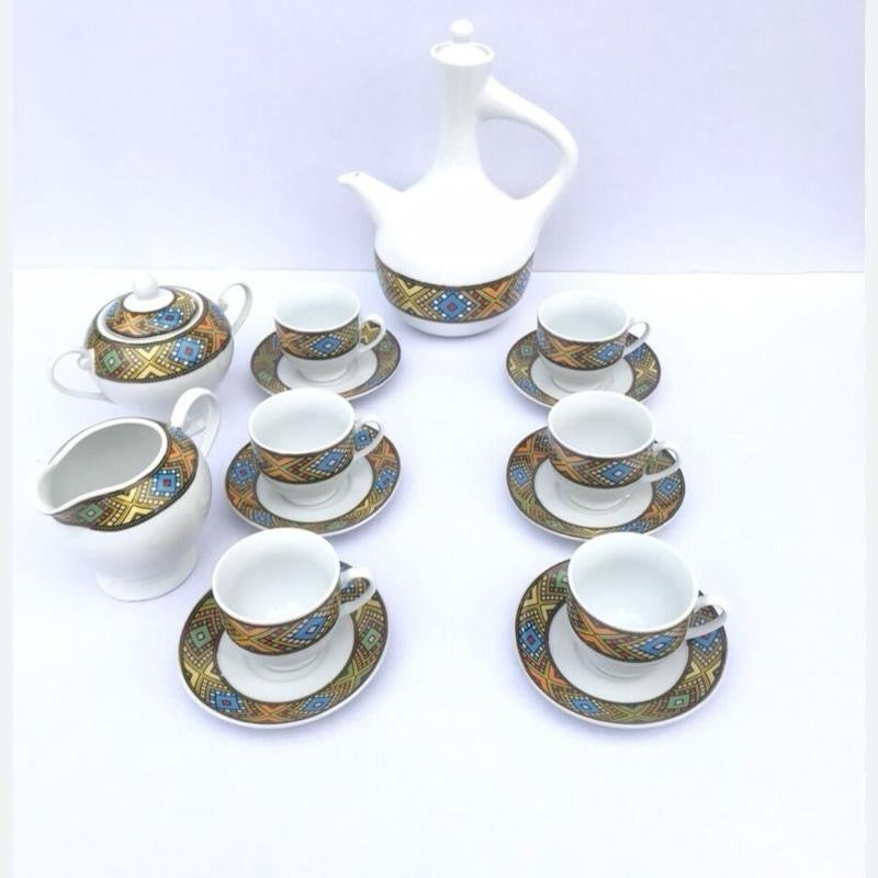 - Includes: 6 cups, 6 saucers, coffee pot (Jebena), sugar pot, and milk pot.